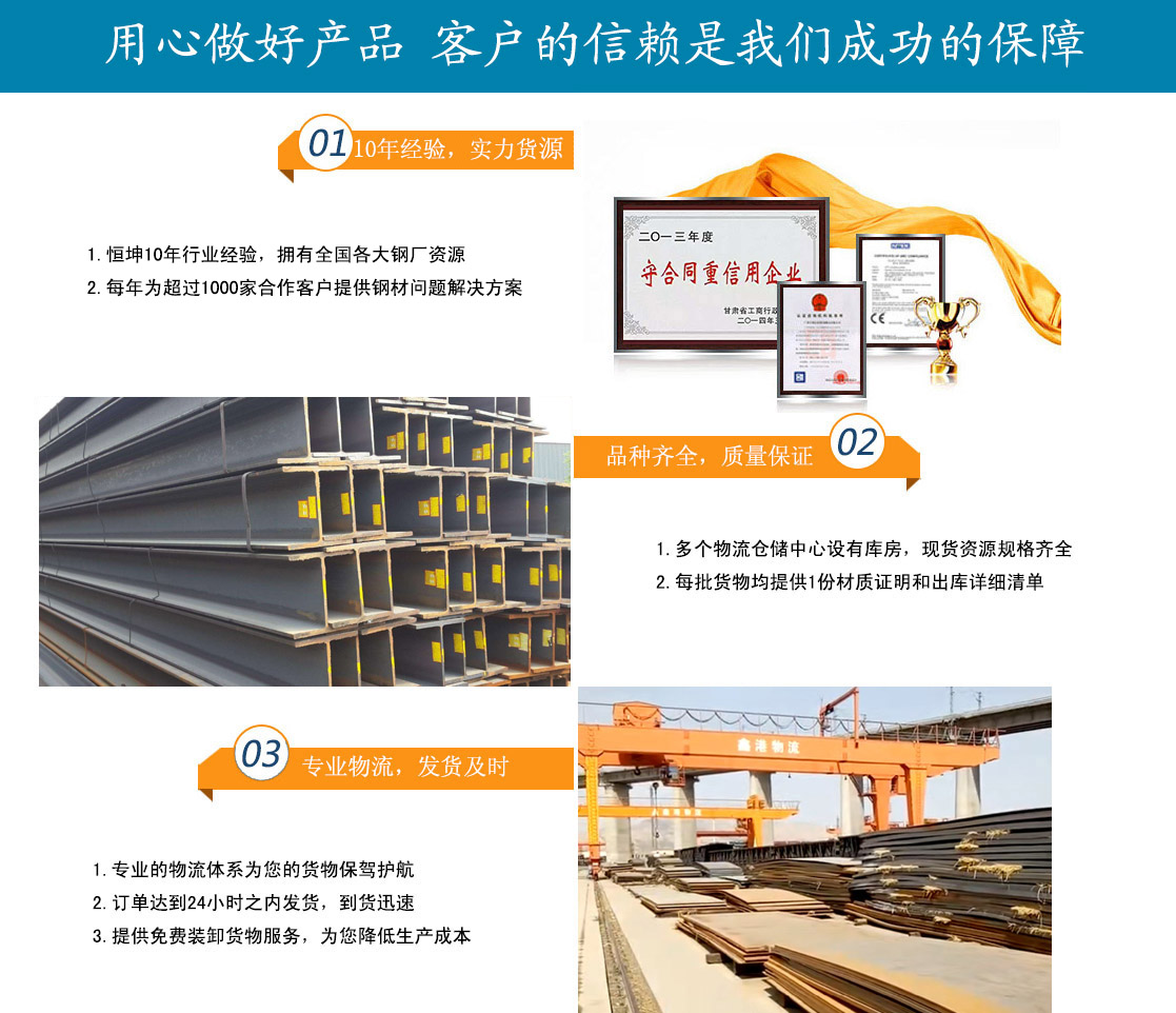蘭州恒坤商貿(mào)有限公司立足于鋼材貿(mào)易,主要經(jīng)營(yíng):鋼板、角鋼、工字鋼、槽鋼、H型鋼、鍍鋅槽鋼、鍍鋅角鋼、鍍鋅板、鍍鋅卷、鍍鋅圓鋼、鍍鋅工字鋼多種型號(hào)鋼材產(chǎn)品。多年來(lái),我公司始終堅(jiān)持質(zhì)量第一,信譽(yù)至上的經(jīng)營(yíng)方針,與酒鋼、包鋼、八鋼、唐鋼、鞍鋼、萊鋼、兗礦、日照鋼鐵、濟(jì)鋼,成都、天津等多家企業(yè)達(dá)成大批量物資供應(yīng)協(xié)議,并且與省內(nèi)外多家客戶建立了合作關(guān)系。